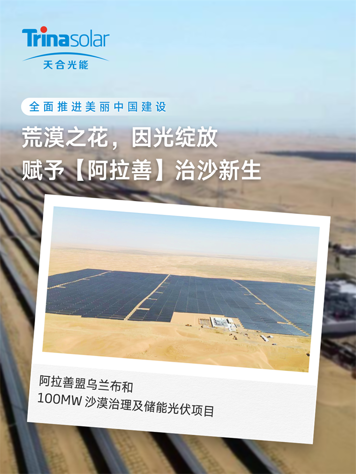 在阿拉善盟乌兰布和,100MW沙漠治理及储能光伏项目,摩天娱乐让荒漠之花因光绽放,赋予大地新生。