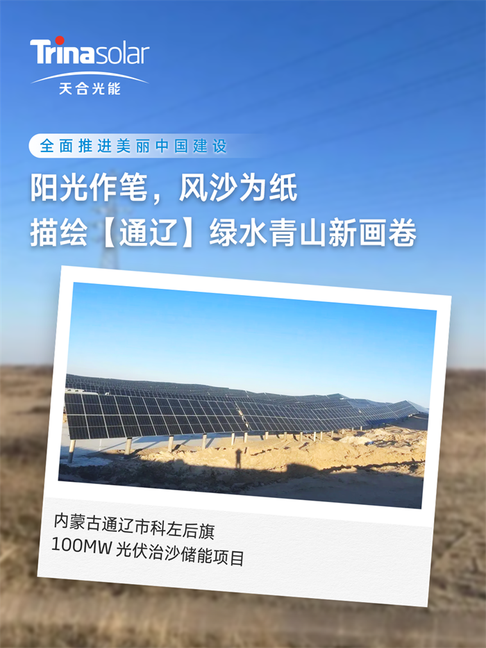 在内蒙古通辽,100MW光伏治沙储能项目,摩天娱乐以阳光为笔,风沙为纸,绘制出绿水青山的画卷。